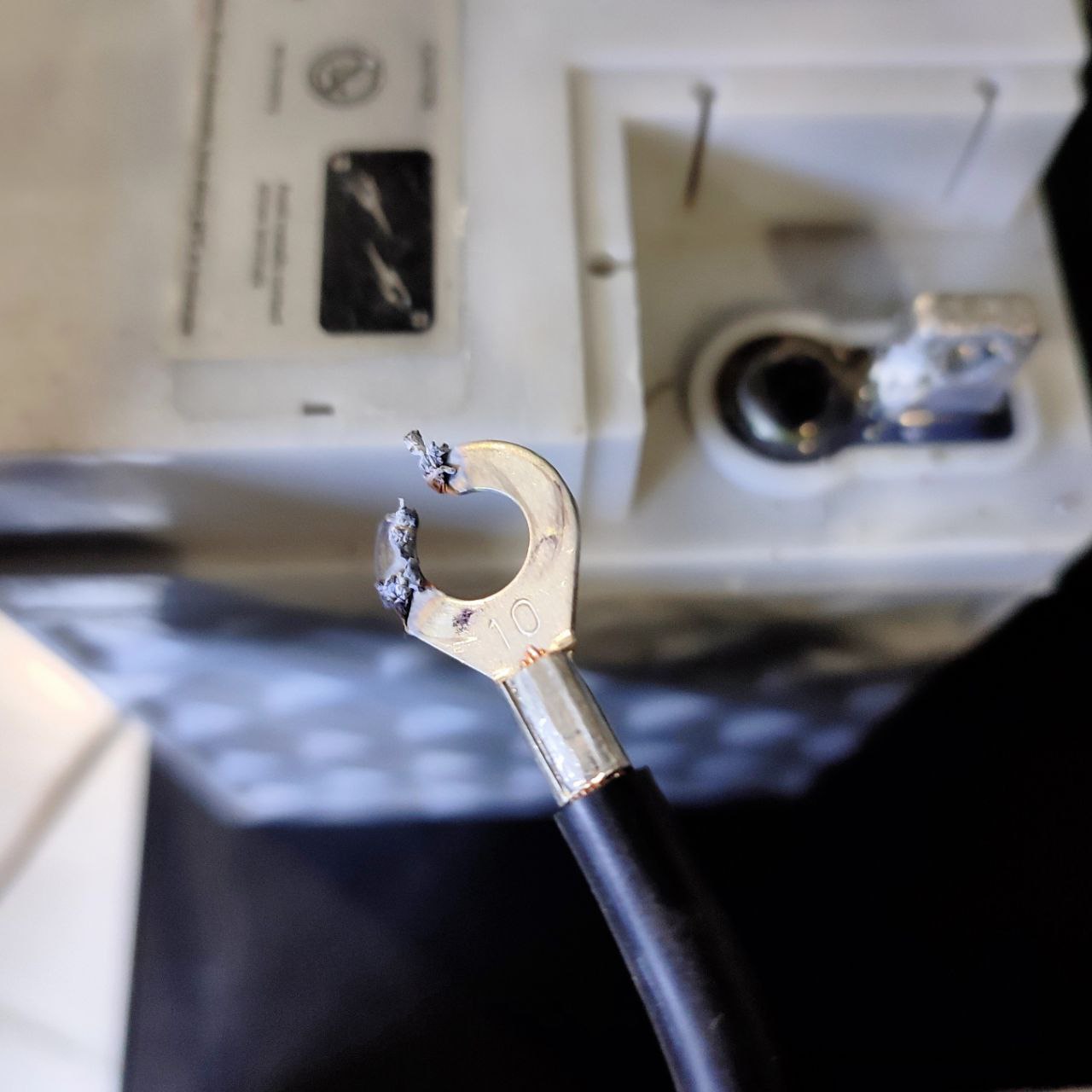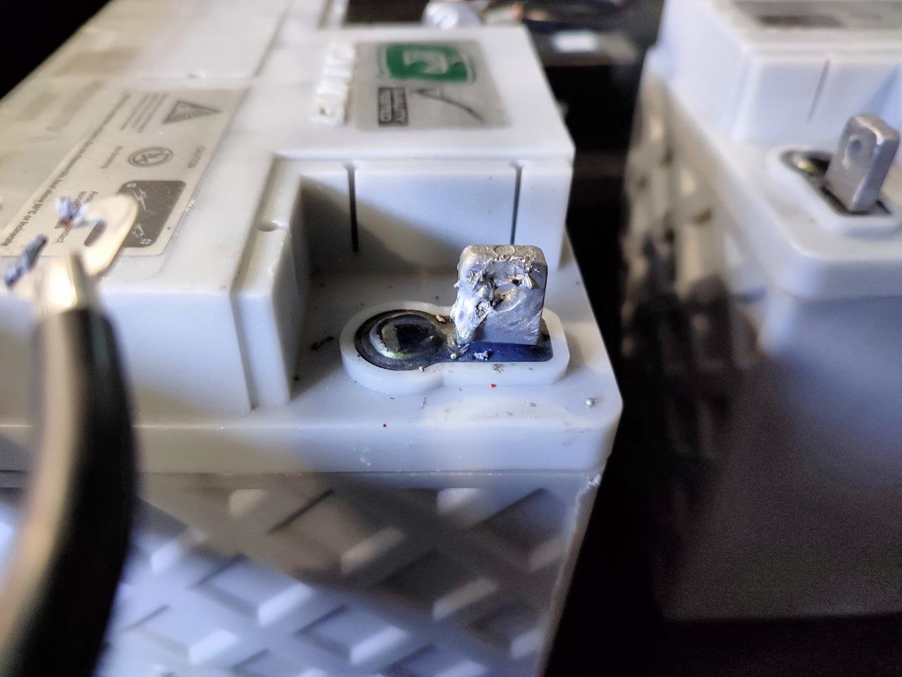 So when I went to remove the other connecting wires, the wrench shorted the two halves and this loosely touching terminal arced and melted along with part of the battery terminal.