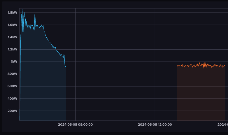 I used InfluxDB’s [ICODE]integral(unit: 1h)[/ICODE] function to calculate the area under these two graphs to get Wh (?) consumption numbers: