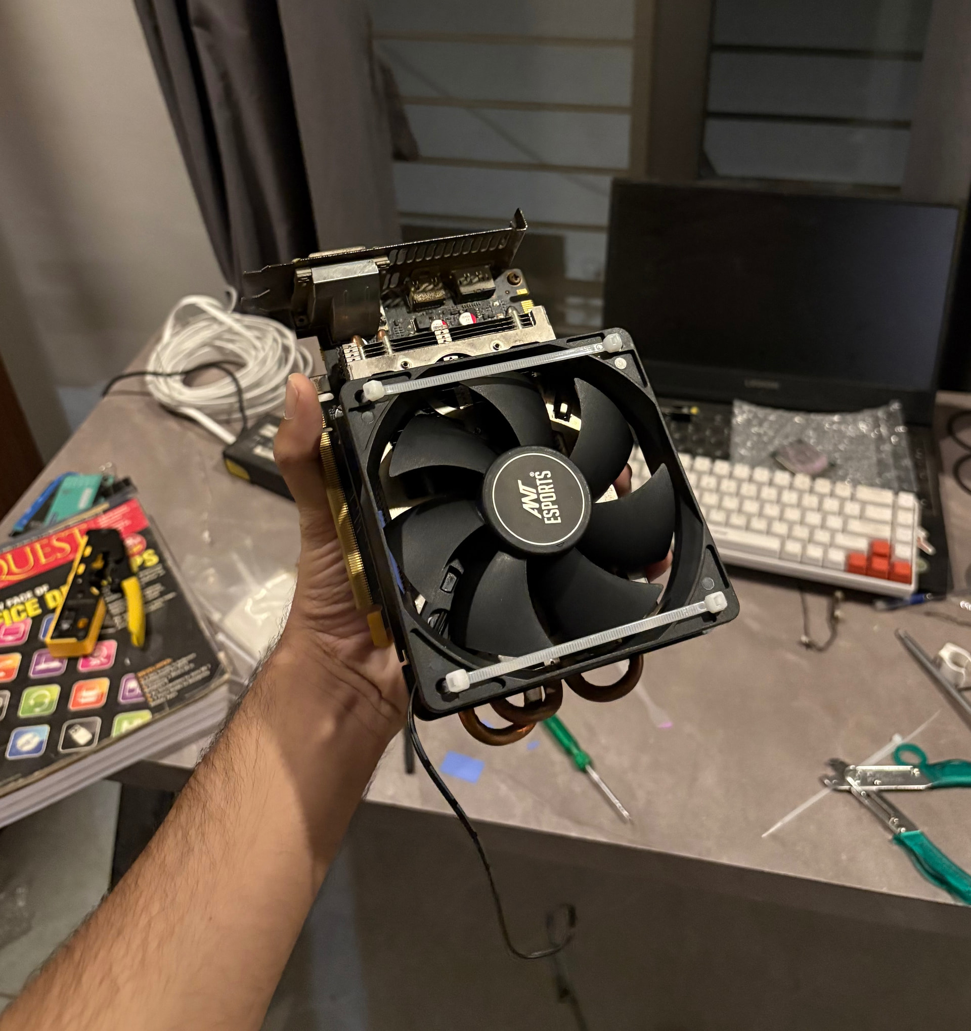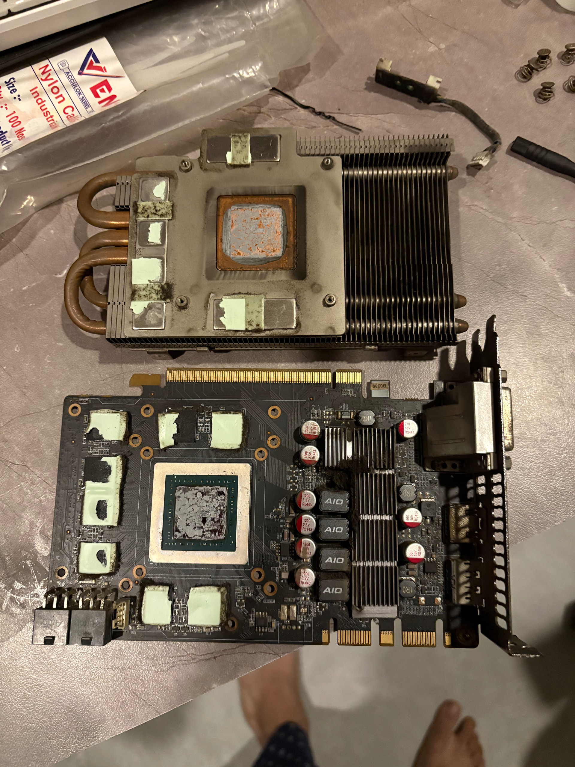 so i cleaned the gpu (it was very dirty from inside) added thermal pads to the VRMs, added cooler master cryofuze thermal paste and then attached a 120mm fan to it. it works absolutely fine.